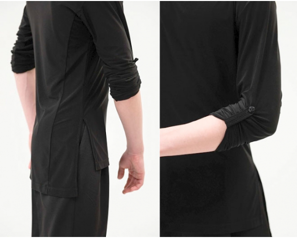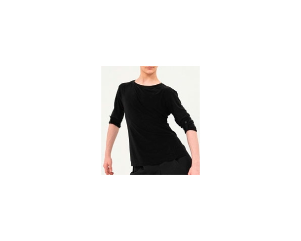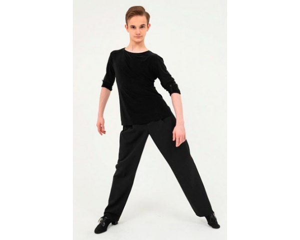 Мужской тренировочный лонгслив для спортивных бальных танцев. Изделие полуприлегающего кроя с укороченной полочкой и удлиненной спинкой. По бокам разрезы. Рукава регулируются пуговицами.