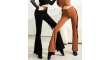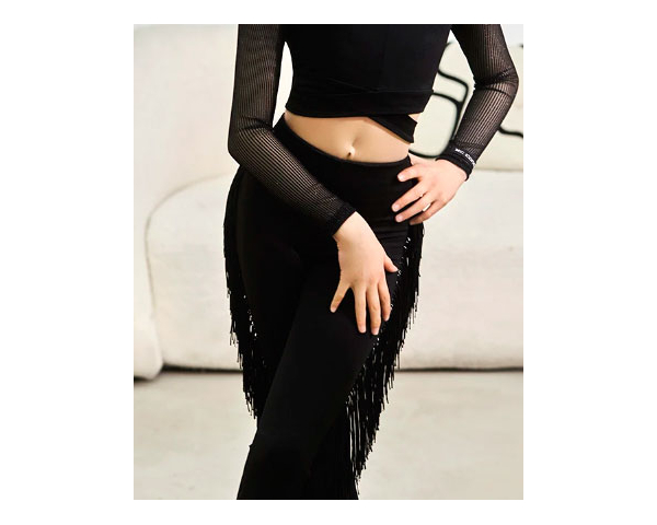 Тренировочные брюки полуприлегающего силуэта выполнены из эластичной ткани, которая очень удобна в уходе, не деформируется после стирки и не сковывает движения во время энергичных занятий. Подходит для всех видов танцевально-спортивных занятий. Брюки имеют клеш от колена и украшены бахромой.