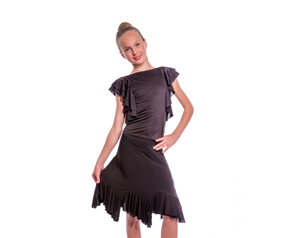 Юбка выполнена из легкой, эластичной ткани, которая не сковывает активные движения во время танца. Главным декором юбки являются вставки - воланы, которые придают юбке пышность.