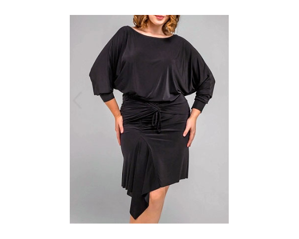 Юбка средней длины, со вставками в виде фигурных клиньев, сшита из струящегося трикотажа. Отличительной особенностью этого материала является его легкость. При большом объеме по низу изделия, ткань легко взлетает вверх и красиво подчеркивает каждое танцевальное движение.